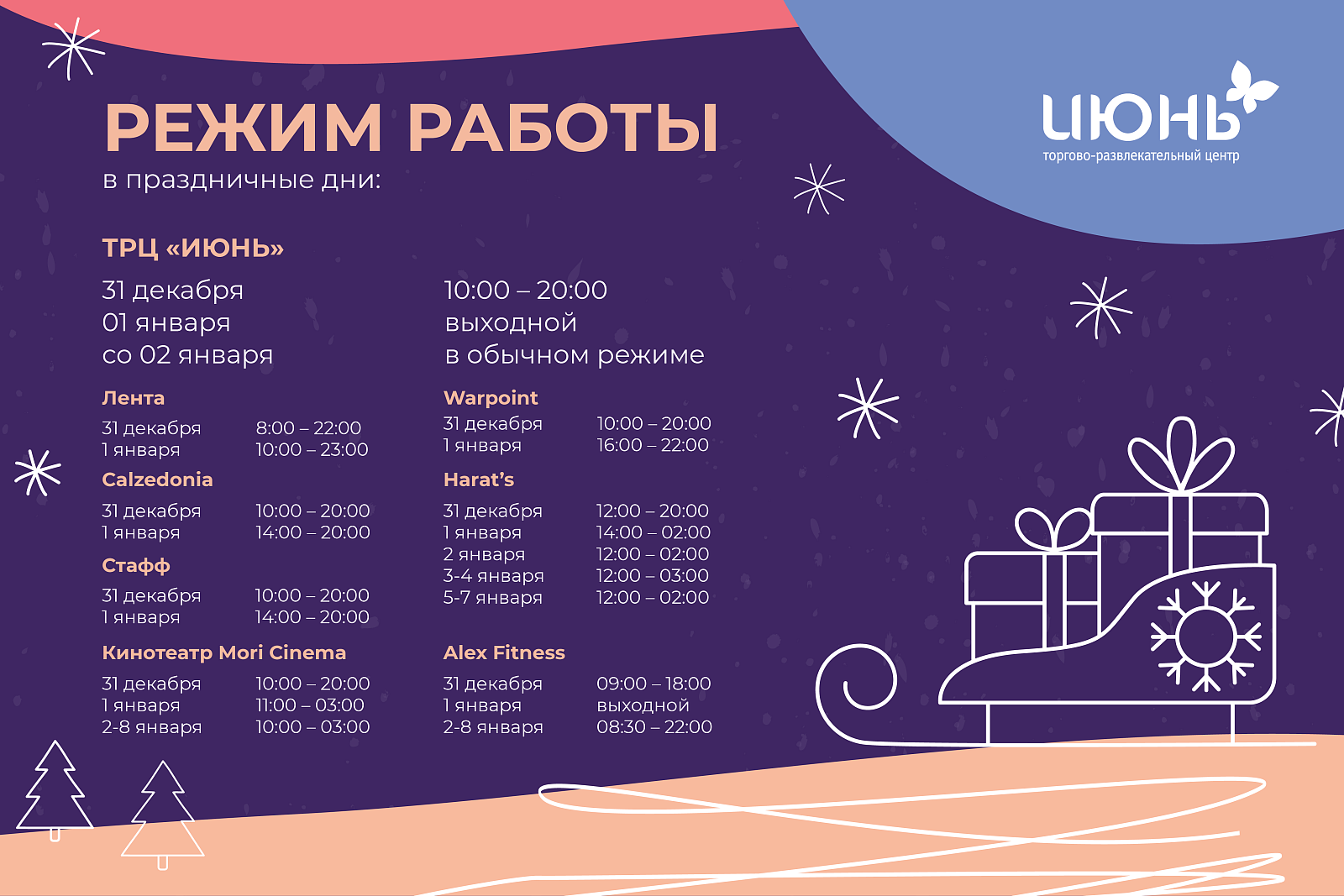 Режим работы ТРЦ ИЮНЬ в новогодние праздники: